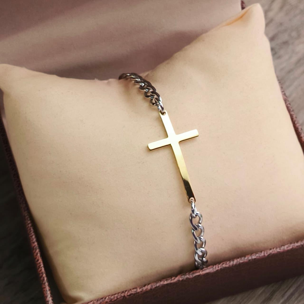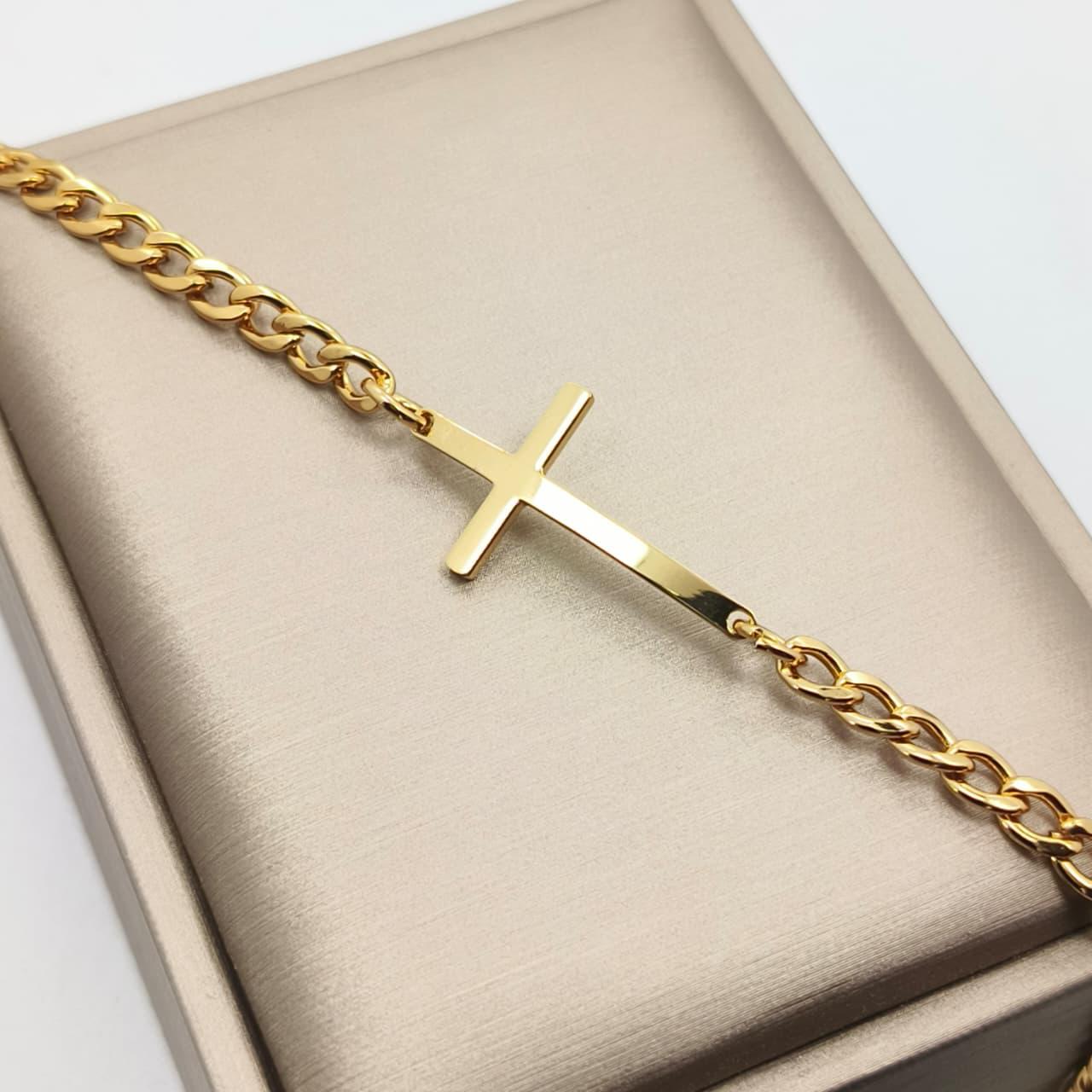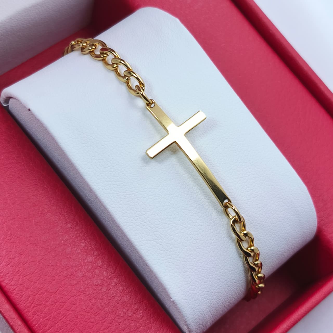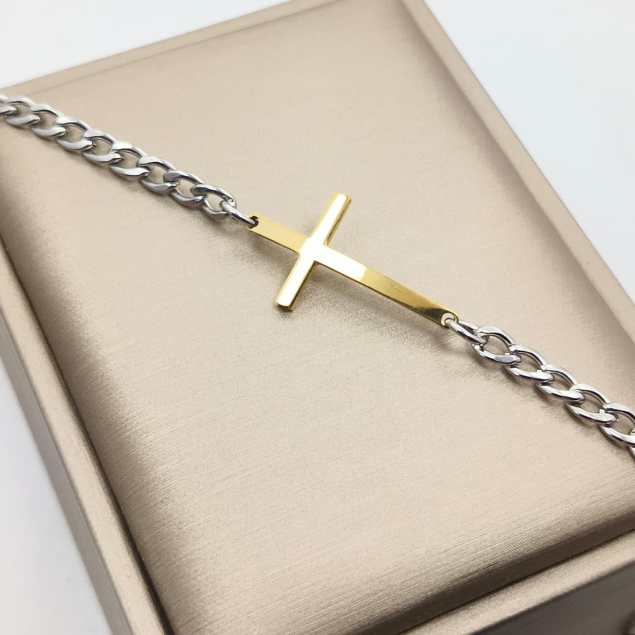 🔒 Su tejido cubano de eslabones gruesos otorga presencia y resistencia, mientras que el dije central en forma de cruz representa guía, protección y conexión con lo divino 🙌.